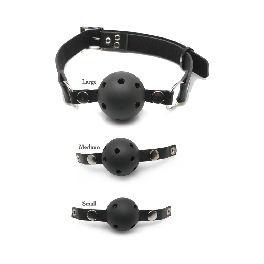 Don’t say a word! The Ball Gag Training System is perfect for beginners who are new to being gagged, yet versatile enough to satisfy a pro. The 3 gag training system allows you to start with a small gag and gradually work your way up to the larger one and go from mild to wild as you progress! Each gag is interchangeable using the snaps, made from non-toxic plastic and fitted with holes to make breathing easy. The sturdy black leather strap easily adjusts to fit most sizes, giving you instant control over when, and how often, your lover speaks. You will teach your partner the meaning of submission in no time at all – remember practice makes perfect!The small measures 1.5″, the medium is 1.75″ and the large is 2″ in diameter.
