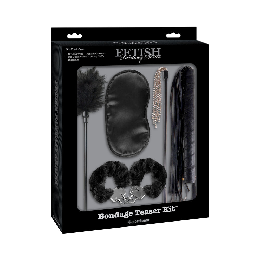 Turn your bedroom into an erotic playground with this first-timers kit. Everything you need to explore your fetish fantasies is included: Satin Love Mask, Feather Tickler, Cat-O-Nine Tails, Furry Cuffs and Beaded Whip.