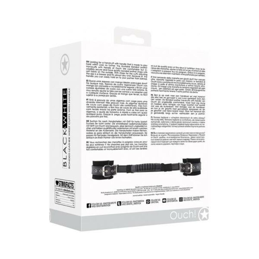 Ouch! Black & White Bonded Leather Hand Cuffs With Handle With Adjustable Straps Black