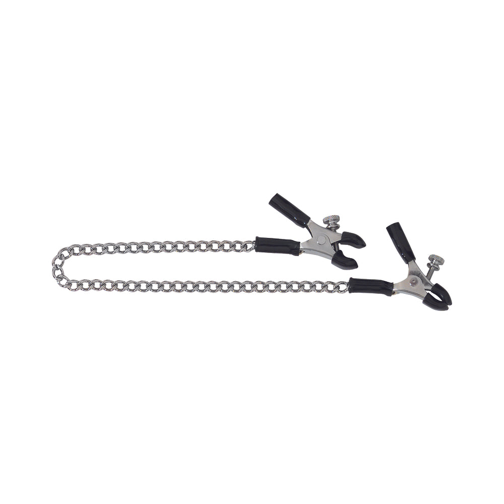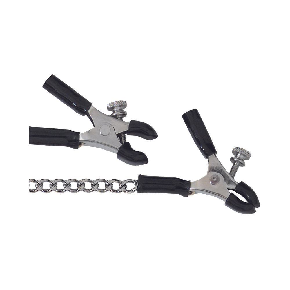 Spartacus Adjustable Nipple Clamps With Curved ChainApply the perfect amount of pressure with these adjustable nipple clamps. The stimulating effect will make your nipples the center of attention, as they should be.