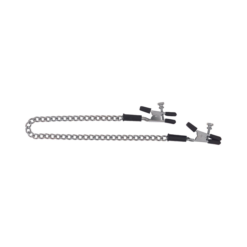 Spartacus Adjustable Nipple Clams With Curbed Chain Rubber TippedApply the perfect amount of pressure with these adjustable nipple clamps. The stimulating effect will make your nipples the center of attention, as they should be.