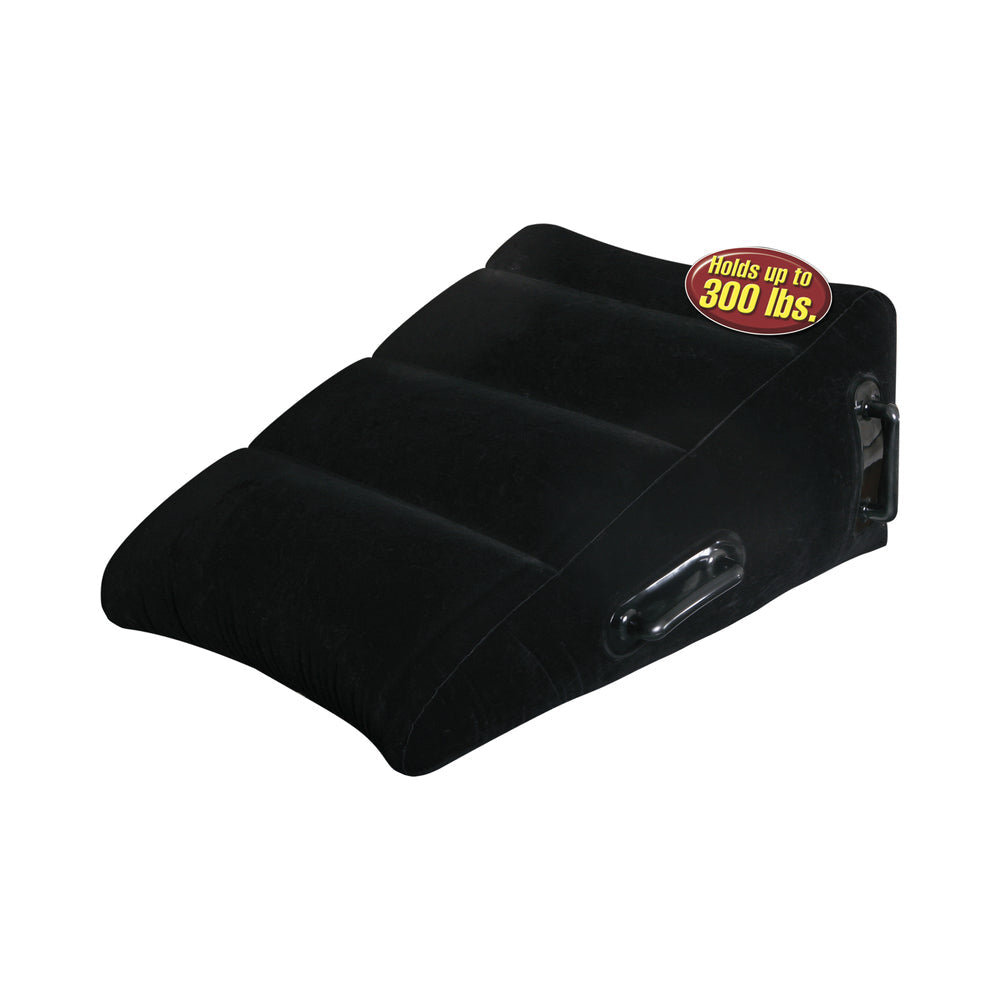 Indulge in your wildest fantasies with this Inflatable Position Master. The slanted, flocked design allows you to relax in any position without sliding off, while the EZ-Grip love handles are perfect for maintaining difficult positions without losing your rhythm. The air seal valve makes inflating the wedge a snap, and when the fun is over, simply deflate the Position Master and it is ready to go where you go. It is perfect for those romantic getaways and no one will know whats in your bag! Do it all with greater ease, no matter what position you are in! And lubricant does not even show up on the surface making it easy to clean, too! Holds up to 300 pounds. Inflatable dimensions are 14 inches tall tapering down to 7 inches tall, 31.5 inches long end to end, and 24 inches wide.