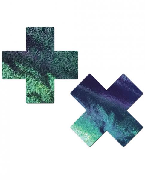 Liquid Black Opal Iridescent Cross Nipple Pasties by Pastease are hand made in the USA of durable, shiny pleather material that forms to curves and resists wrinkling over hardening nipples. Just peel and stick on clean, dry skin. All Pastease feature latex free, medical grade, waterproof adhesive that stay securely in place for as long as you like and until they are gently removed. Conceal or reveal with Pastease nipple pasties when worn with a sexy outfit, daring bikini, sheer top, revealing dress, Hefty bag, body lotion, crazy costume, party theme or nothing at all! Dimensions 3 inches wide by 3 inches tall. Coverage 1.6 inches.