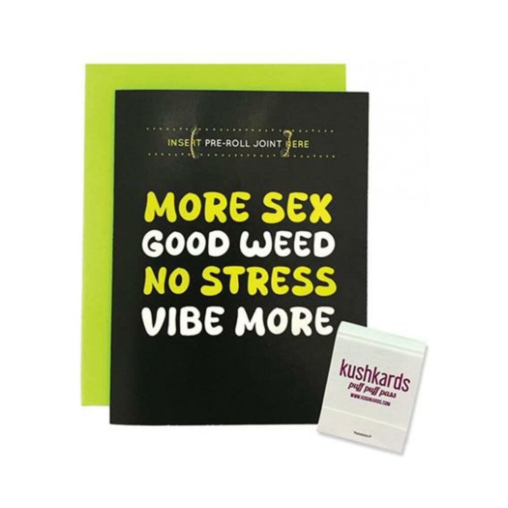 Embrace the mantra of relaxation and enjoyment with our bold and spirited greeting card. The message “More Sex Good Weed No Stress Vibe More” is not just a statement; it’s a lifestyle. This card is perfect for those who live life to the fullest and embrace all of its pleasures. With its vibrant neon lettering against a stark black background, it stands out as a beacon of good times and chill vibes. Whether it’s for a partner, a close friend, or someone who shares your philosophy, this card is sure to make a statement and bring a smile. Patent Pending. Design Details: A dynamic greeting card with a bold black background, highlighting the mantra ‘MORE SEX GOOD WEED NO STRESS VIBE MORE’ in vivid yellow and white letters. Front Message: More Sex, Good Weed, No Stress, Vibe More Inside Message: (Blank Inside) Size: 4.25″ x 5.5″ Includes: Greeting Card, Envelope, Plastic Wrap,Matchbook
