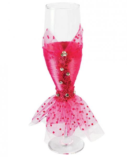 Dress up those champagne flutes at your bachelorette party. Wedding dress with pink lace. From Forum Novelties.