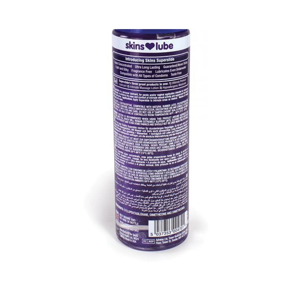 Skins Superslide is the ultimate 3-in-1 silicone-based lubricant. With a myriad of uses, both in and out of the bedroom you are sure to receive value for money from the highly concentrated long-lasting and luxurious formula. Slide into someone more comfortably… Superslide is made from only the highest quality silicone, making it light and smooth but with all the staying power you would ever need. Superslide lubricates even underwater, so you can take it into the shower or bath for added fun! Skins Superslide contains 100% pure grade silicone lubricant making it ultra-long lasting. Silicone will not harm latex and is perfectly safe for internal use as silicone molecules are too big to enter the body through the skin or body linings. Just remember not to use silicone with silicone toys. Super concentrated: a little goes a long way Guaranteed never sticky Latex safe Clear, odorless formula Ingredients: Cyclopentasiloxane, Dimethicone, Dimethiconol