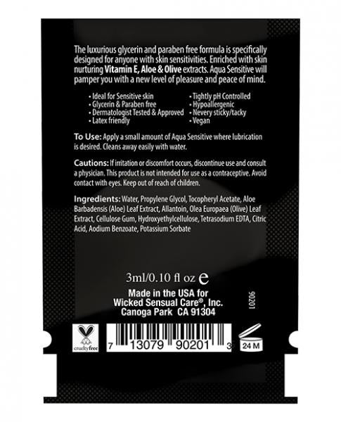 Indulge yourself and your most delicate areas with the incredibly smooth and satiny Wicked Sensual Care Collection Aqua Sensitive hypoallergenic lubricant. The luxurious Glycerin free and Paraben free formula is specifically designed for sensitive skin to heighten sensation & arouse satisfaction. Enhanced with skin nurturing Aloe and Olive extracts, as well as Vitamin E, Aqua Sensitive will caress you to new levels of pleasure. Aqua Sensitive Lubricant is ideal for sensitive skin, hypoallergenic, latex condom compatible, sex toy friendly, glycerin free and paraben free, pH balanced, never sticky, dermatologist tested and approved and vegan. No animal by products or testing.