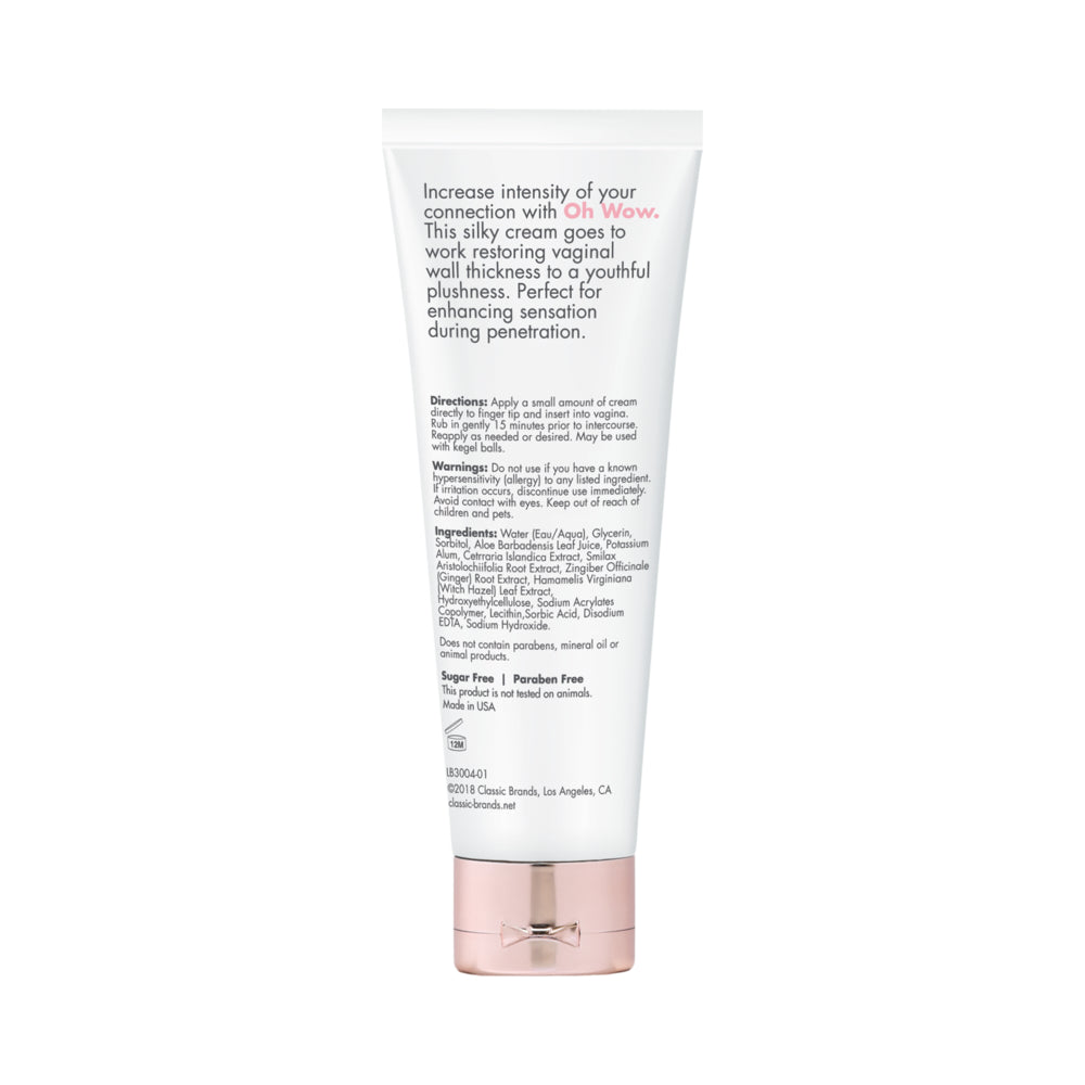 Increase intensity of your connection with Oh Wow. This silky cream goes to work restoring vaginal wall thickness to a youthful plushness. Perfect for enhancing sensation during penetration. Apply a small amount of cream directly to finger tip and insert into vagina. Rub in gently 15 minutes prior to intercourse. Reapply as needed or desired. May be used with kegel balls. Silky cream, ideal for enhancing connection during intimacy. Formulated to temporarily enhance sensation during penetration. Fragrance Free. Ideal for toy, self and couple’s play. This product does not contain gluten or sugar. This product does not contain parabens or mineral oil. This product is not tested on animals. Made in the USA.