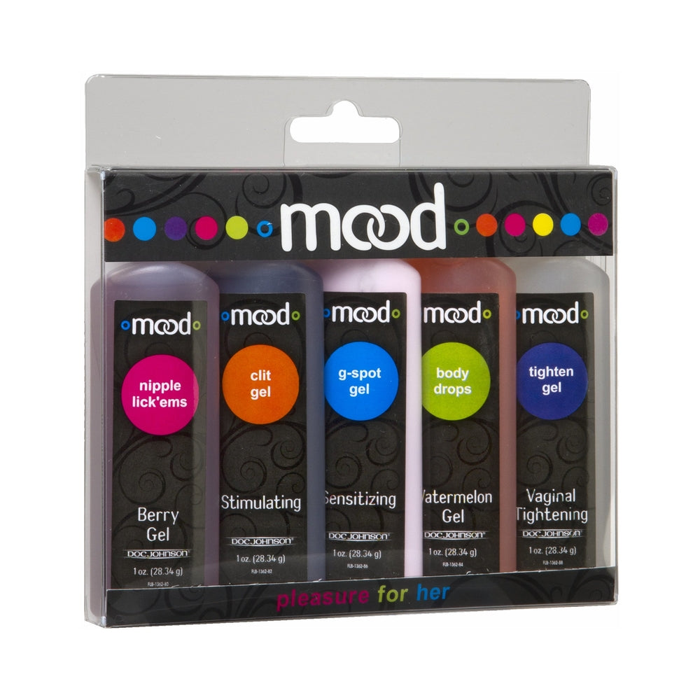 Five amazing female focused formulas! The Mood Pleasure for Her multi-pack features a flavorful Berry Nipple Lick’ems Gel, an invigorating Stimulating Clit Gel, succulent Watermelon Body Drops, G-spot Sensitizing Gel, and a Vaginal Tightening Potion. Sugar free. Proudly, made in America. Each Mood Gel comes in a chic 1 fluid ounce bottle.