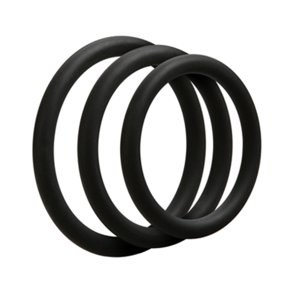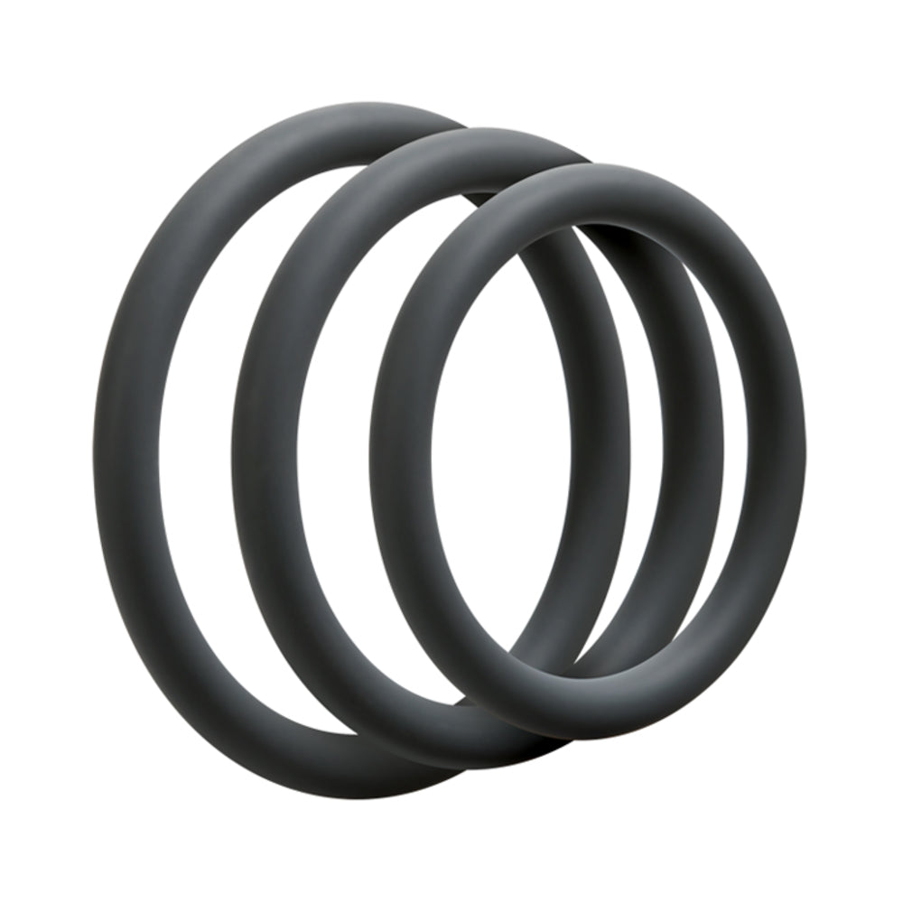 Achieve size and girth with three rings in 40mm, 45mm and 50mm diameters. Thin silicone rings are ultra-stretchable for easy use around the shaft or testicles, making them perfectly suited for creating an optimum erection and prolonging ejaculation.