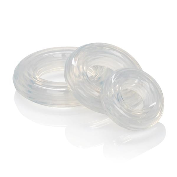 Ultra stretchy Silicone rings. Totally seamless. Thick and durable for versatile use. Provides girth and support. Soft and comfortable. Material Silicone. Medium ring .75 inch. Large ring 1 inch. XLarge ring 1.25 inches. From Cal Exotics.