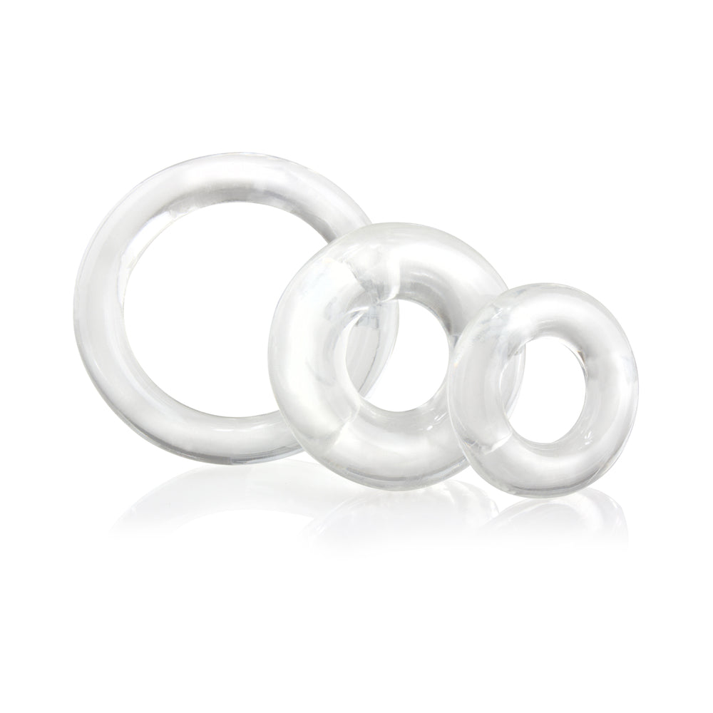 Helps keep him harder longer with stronger, fuller and firmer erections. Package includes three unique super-stretchy sizes. Choose from Stronger, Firmer or Harder tensions. Stretch the ring around the penis and testicles and wear at the base of the body to allow the snug cock ring to do its job. Allows erections to last longer while helping prevent premature ejaculation, while increasing orgasmic intensity.