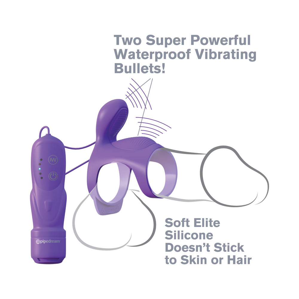A pleasure ring that delivers incredible clitoral stimulation and internal vibrations at the same time. With a pair of powerful vibrating bullets placed inside and on top of the super soft silicone cock cage, this vibrating erection enhancer turns ordinary sex into marathon sessions. He will love the tight squeeze, extra buzz, and rock hard erections, while she enjoys the wall banging climaxes delivered by the powerful clitoral vibrations. Choose between five speeds.Made from body safe Elite Silicone, the rear ring wraps around your cock and balls, while the front ring squeezes your shaft increasing your size. The flexible vibrating clit stimulator is perfectly angled to nestle up against the clit, delivering direct stimulation to her sweet spot during intercourse. Lotion and toy cleaner included. Vibrating ring requires 2 AAA batteries, not included.