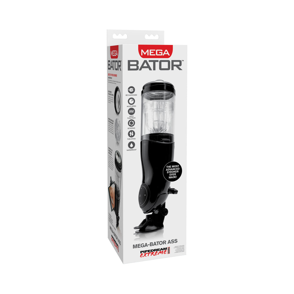 This hands-free masturbator does all the work while you watch your mobile device. Just push a button and enjoy explosive results. Reciprocating action spins and thrusts simultaneously. Features a custom TPE pleasure sleeve that mimics the body part. The ass orifice teases and pleases with each rotation. USB rechargeable. Approximate charge time is 2 hours, long enough for 1.5 hours of runtime. Sleeve Suspension System features a powerful magnet that locks the moving cup into place, making it easy to remove for cleanup. The Mega-Bator features five speeds and ten pulsation patterns. Clamp and locking tab make it convenient to attach a mobile device. Powerful suction cup features air-lock activator. Waterproof. Package includes air lock suction cup, mobile device holder, USB charging cord, and toy cleaner.