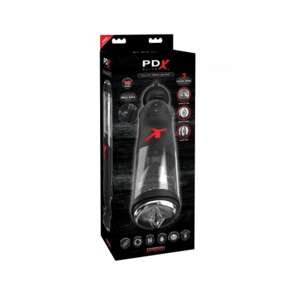 The Deluxe Mega-Bator is the only hands-free masturbator in the world that does all of the work for you, so you can experience the ultimate hands-free pleasure experience! The innovative Deluxe Mega-Bator combines hands-free rotation and thrusting that can be enjoyed in 10 unique patterns for completely customizable masturbation sessions.Enjoy the best of both worlds! Intense rotation combined with powerful piston-action thrusting—the innovative hands-free Deluxe Mega-Bator spins and thrusts you to explosive pleasure! With 3 interchangeable pleasure toppers you can enjoy a snug pussy, tight ass or supple lips depending on your mood. Slide through the realistic pleasure topper to enjoy a stimulating textured sleeve lined with rows of tiny ribs that tease your shaft with every thrust. The powerful motor ensures strong, steady rotation, piston-action thrusting, and exclusive sleeve suspension system will completely satisfy your entire penis, giving you the best stroker session you’ve ever had!Spinning & Thrusting Action – Unlike ordinary automatic strokers that either spin around or stroke up and down, the Deluxe Mega-Bator combines both rotation and stroking movements for the most realistic sensations ever reproduced. The unique motion allows the textured pleasure sleeve to rotate while the gear thrusts up and down, giving you incredibly lifelike stroking sensations.Featuring Our Exclusive Sleeve Suspension System – Our state-of-the-art Sleeve Suspension System features a powerful magnet that locks the moving cup into place, making it easy to remove the sleeve for cleanup after the fun. Once the sleeve is inserted into the plastic tube and suspended from the top of the cylinder, the super-stretchy material allows the user to get maximum penetration as the cup magically stretches when you’re inside the sleeve.5 Speeds & 10 Patterns – The Deluxe Mega-Bator features 5 powerful speeds and 10 thrilling pulsation patterns. Use the arrow keys to cycle through the functions, and use the plus and minus keys to increase or decrease the speed.Interchangeable Realistic Pleasure Toppers – Choose from 3 Deluxe Mega-Bator toppers – a snug pussy, tight ass or supple lips. Each topper is smooth, stretchy and warms to your body temperature to offer you a realistic feel.One-Touch Control Pad – Command 5 powerful speeds and 10 thrilling pulsation/rotation patterns to surround your penis with a maximum mind-blowing experience!Handheld or Hands-free Operation – Use your Deluxe Mega-Bator as a hand-held stroker, or mount it to the suction cup bracket for a completely hands-free experience! Place your own mobile device in the convenient mobile device clamp for added visual stimulation. Conveniently Rechargeable – Rechargeable via the USB charging cable included. Plug your Deluxe Mega-Bator into any USB port to charge it. The LED light will blink while the unit is charging and turn solid once the charging is complete. Approximate run time is 1.5 hours and approximate charge time is 2 hours.Care Instructions: The PDX Elite‚ Deluxe Mega-Bator toppers and sleeve are removable for easy cleaning. Simply unscrew the topper to switch or remove. Unclip the clear ring at the top of the sleeve case to remove the sleeve. The clear ring holds the sleeve in place for usage. The Deluxe Mega-Bator includes a travel cap for storage. Clean up is a snap after the fun with Refresh Toy Cleaner and warm water. If desired, use a water-based lotion like Moist® with this product.Operating Instructions: Before You Begin – The Deluxe Mega-Bator is shipped with a plastic insert separating the magnets. The pleasure topper and sleeve must be removed in order to remove the plastic insert so the Deluxe Mega-Bator is ready to be used.Power On – Press the center button on the One-Touch Control Pad to turn your Deluxe Mega-Bator on.Start – Press the right arrow to start rotation and thrusting. Continue to press the right arrow to cycle through 10 pulsation patterns. Press the left arrow to return to the previous pattern. Intensity – Use the +/- keys to increase or decrease speed through 5 levels of intensity.LED Lights On – LED Lights are activated automatically when the Deluxe Mega-Bator is turned on.LED Lights Off – Press the center button to turn your Deluxe Mega-Bator off.
