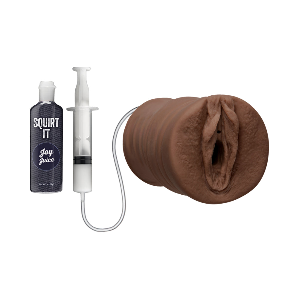 Made of lifelike Ultraskyn material, this masturbator squirts on command thanks to an easy-to-fill syringe and a 1 fl. oz. bottle of Chocolate Joy Juice. Squirt It also features a tight pleasure tunnel with plush internal ribbing, for even more pleasure. Squeeze the attached squirt syringe to flood the Squirt It and yourself with sweet pussy juice. Open-ended design makes cleanup a breeze.