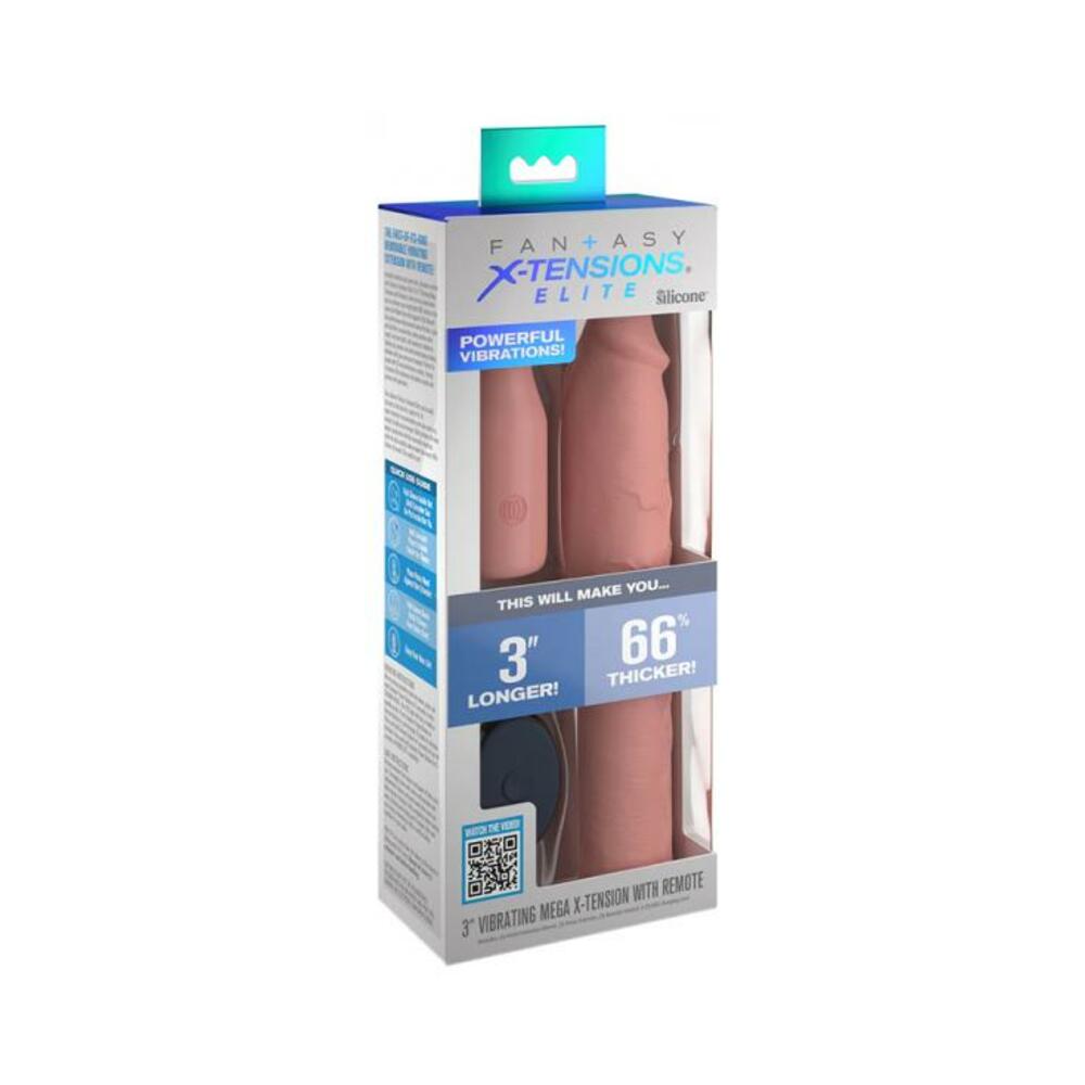 Instantly transform your penis into a pleasure machine with Fantasy X-tensions Elite! The 3andrdquo; Vibrating Mega X-tension with Remote is the first-of-its-kind where you can enhance your length/girth AND vibrate at the same time! Made from ultra-hygienic Elite Siliconeandtrade;, this performance-enhancement sleeve fits like a glove and feels like a second skin, giving wearers extra length, increased girth, and maximum confidence. Satisfy your partner and avoid embarrassing midway letdowns with your new secret weapon! Perfect for people with ED and performance anxiety, Fantasy X-tensions Elite enhancers will deliver results both partners will appreciate.Your silicone Fantasy X-tension Elite can be easily trimmed at the base for a perfect fit. Itandrsquo;s super-stretchy to accommodate most sizes and snug enough to help you last longer. Both partners will enjoy deeper penetration with the removable extenders, while the ultra-realistic sleeve makes the wearer 66% thicker all around. This could be you! KEY PRODUCT FEATURES andbull; 3 (7.6 cm) removable vibrating extender with remoteandbull; Extender and remote are USB rechargeableandbull; Adds up to 66% girthandbull; High quality Elite Siliconeandtrade;andbull; Lifelike textures andamp; detailsandbull; Trim for perfect fitandbull; Stretches to fit most sizesandbull; Perfect for people with ED