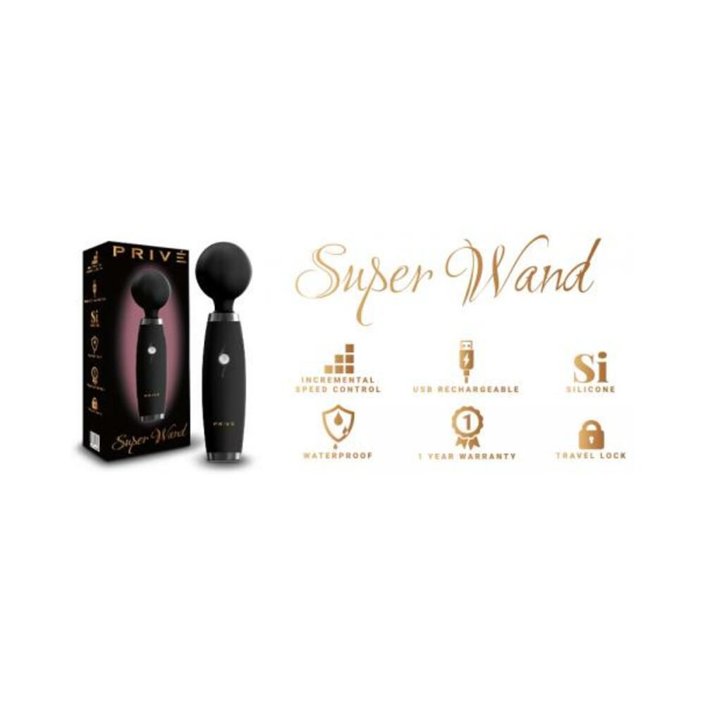 Prive Super Wand from Prive Toys. Get revved up and ready to go with the Super Wand! This intense turbo charged motor has a unique incremental speed vibration and 360 degree flexibility designed to target all the right spots. Features: Intense incremental speed vibration. Made using Medical Grade Silicone and ABS Plastic. Ultra hygienic. Easy to clean. Size Length 8.5 inches. Diameter 2 inches. USB Rechargeable. Waterproof. Travel lock feature: triple click on/triple click off. 1 Year Warranty. UPC: 746092197333. Categories: Vibrators, Eco-Friendly Sex Toys, Rechargeable Vibrators, Magic Wands, Body Massagers, Health and Beauty Aids, Sex Toys for Women. 2024