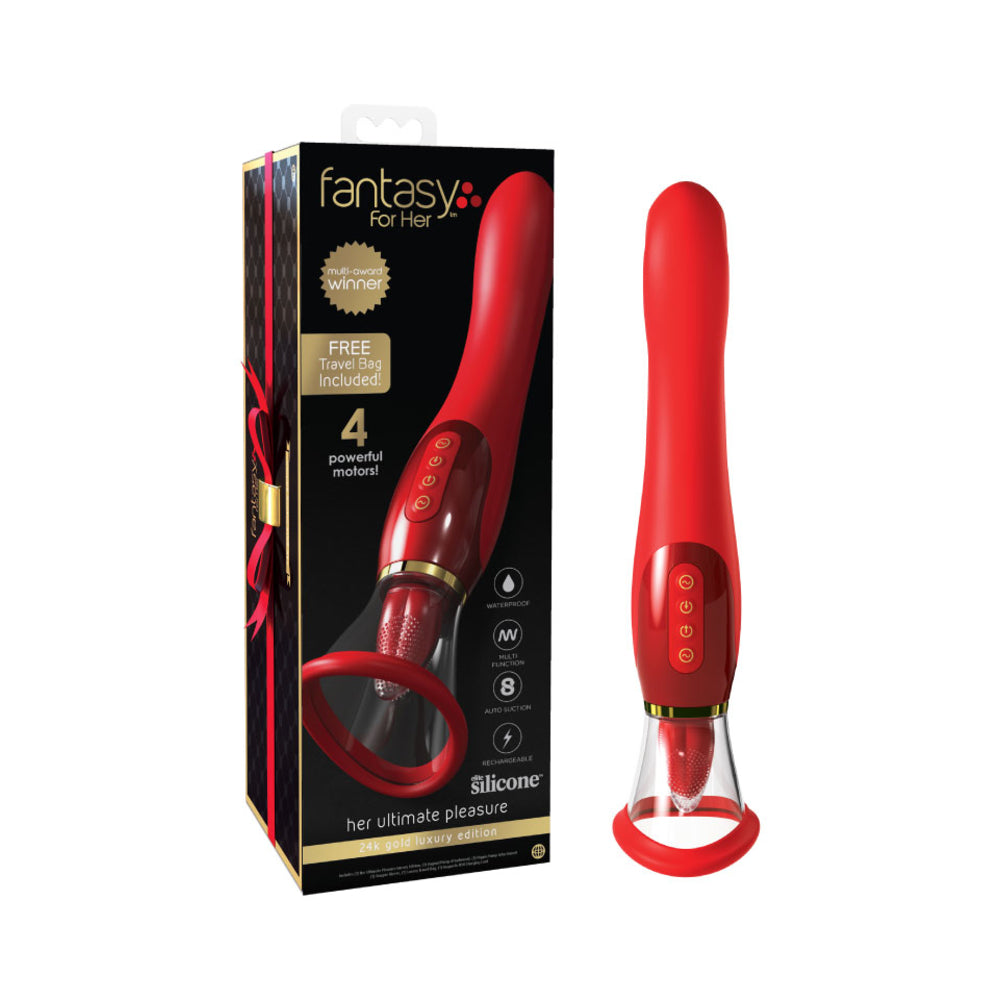 Her Ultimate Pleasure 24K Gold Edition features everything you love about the original while it struts a limited rich red color, stunning 24K gold plated accent, and includes a deluxe travel bag, all contained inside a luxury gift box perfect for any occasion. She always craved oral sex play and wished she could enjoy more often. Now she could. Her Ultimate Pleasure would be able to give her the ultimate ecstasy she was looking for. First, she pressed the button to activate the vibration and then traced her body with the pulsating pinpoint pleasure. She knew this was going to feel so good deep inside her later- but first she wanted to explore the oral sensations. She placed the oval cone of Her Ultimate Pleasure over her yearning mound. It perfectly cupped her labia, clitoris, and most sensitive lady bits. The pulsing, milking suction was perfectly timed to entice her soft skin, making her tender with sensation. It felt so incredible as if her very essence was being seduced. She pressed another button and the motorized tongue began lapping her swollen clit. With each press, the smooth tongue sensually teased her sensitive sweet spot. She was enthralled with incredible pleasure as she explored all of the various tongue patterns. This was truly the most amazing sensation combination she had ever felt! And then, like a dream, her climax embraced her with breathless tremble. Her Ultimate Pleasure made her sexual fantasy come true. 10 inch long (25 cm) 1.5 inch diameter
