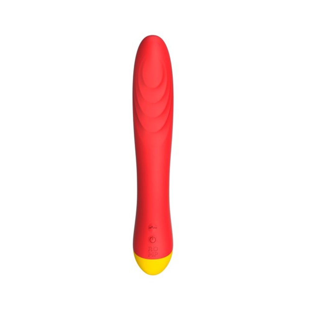 Just like the other stellar sex toys in the ROMP line, the ROMP Hype G-Spot Vibrator is an elevated, yet accessible take on a classic. The ROMP Hype easily triumphs over other comparable G-Spot vibrators! See what all the HYPE is about! This brilliantly powerful, ergonomic vibrator astounds all with its strong, multi-pattern, multi-mode stimulating vibrations. Measuring in at 8.2 inches, HYPE is about twice the length of the long edge of a credit card! Pack it in a purse, backpack, or gym bag to keep HYPE on-hand for easy convenience! This hand-held g-spot vibrator paired with its stimulating ribbed textured is sure to excite and tantalize. The two-button control panel on the handle keeps it simple with easy-to-understand power and setting buttons. This ROMP USB rechargeable vibrator features 4 pattern modes and 6 intensity levels, which means the pleasure possibilities are endless! The vermillion red body and goldenrod yellow trim gives HYPE a fun, yet modern look! HYPE is also 100% waterproof and can be used in the bath, shower, or other wet areas! Perfect for strong stimulation of the g-spot internally, or use the soft, squishy, motorized tip externally to soar to new, stimulating heights! Super quiet and discreet – barely above a whisper, and made from body-safe silicone, all worries are instantly washed away as waves of the powerful, yet balanced vibration roll over and through anyone who desires to wield this must-have g-spotter! ROMP, brought to you by WowTech (the premier provider of sexual health and wellness products such as Womanizer and We-Vibe,) offers quality adult toys at affordable prices, citing, “Pleasure should be available to everyone. No matter their budget.” ROMP products are phthalate-free, latex-free, and are “carefully designed to meet the highest standards, all while retaining a fun and fresh vibe.” Find them in a sex shop near you! Type: G-Spot Vibrator Material: Body-safe Silicone Dual layer soft silicone tip Color: Red (yellow trim) USB Rechargeable Battery: Prismatic Rechargeable battery Waterproof 4 vibration patterns 6 intensity levels Two-button control Quiet Runtime: 60 mins (on highest speed) Charge time: 180 mins Dimensions: 210mm x 36mm x 55mm Length: 21cm/8.2in Warranty: 2 Year