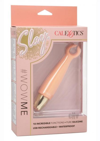 Slip the tickling Slay #WowMe into your luggage for knee-shaking pleasure wherever you go. The tickling teaser fits between your fingers to let you deliver pinpoint tantalization and thrill with flickering vibrations. Get playful while you flicker through 10 indulgent vibration, pulsation and escalation functions with the easy-touch control button. The unique flexible open design is great for exploring sensual sweet spots and delivering pinpoint stimulation with ease. Effortlessly control pure pleasure with an easy-touch silicone button and hold for 3 seconds to turn on or off. Use the smooth single button control to enjoy up to 70 minutes of vibrating pleasure. Charge up your passion in only 1.5 hours by plugging the provided USB cable into the self-sealing charging port on the back of the massager. Materials: Silicone ABS Plastic / Metallic Plating Waterproof Travel Lock USB rechargeable – cord included Charge Time- 90 minutes Max Run Time – 70 minutes Dimensions: Overall Length – 5.25 inches Insertable Length – 4 inches Width – 1 inch One Year Warranty