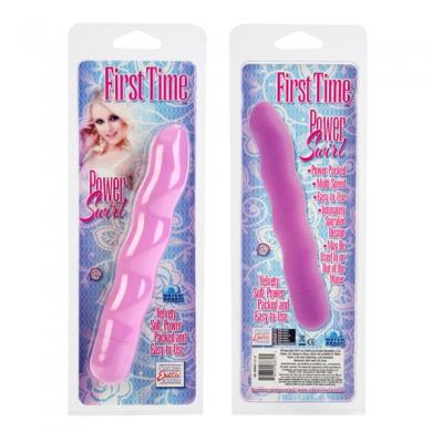 First Time Power Swirl Vibrator is available in two colors Pink and Purple. Each sold separately. First Time Velvety Soft Pleasure Products Designed for First Time or Experienced Users. Make it a memorable experience with the First Time Collection. Velvety soft, power-packed, sensually swirled, and easy-to-use. Multiple speed vibrations. Safe and pure for body and pleasure. Made using phthalate free, non-toxic materials. ABS plastic with Polyurethane PU Cote. Vibrating sex toy requires 2 AA batteries, not included. Do not leave batteries in the vibrator between uses. Vibrator measures 6 inches long by 1 inch wide. Always clean before and after use. Water based personal lubricant is recommended.