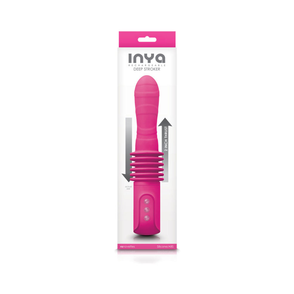 The Deep Stroker Thrusting Vibrator from NS Novelties. The Deep Stroker by Inya features a longer range of motion for profound thrusting and intense vibration for explosive orgasmic pleasure. This powerful and rechargeable vibe is made of body safe silicone and is suitable for use with all lubricants. In N out, Up N Down – the Deep Stroker by Inya. Made using body safe latex free, phthalate free materials Silicone, ABS Plastic. Size 11.5 inches by 2 inches. Thrusting range about 2 inches.