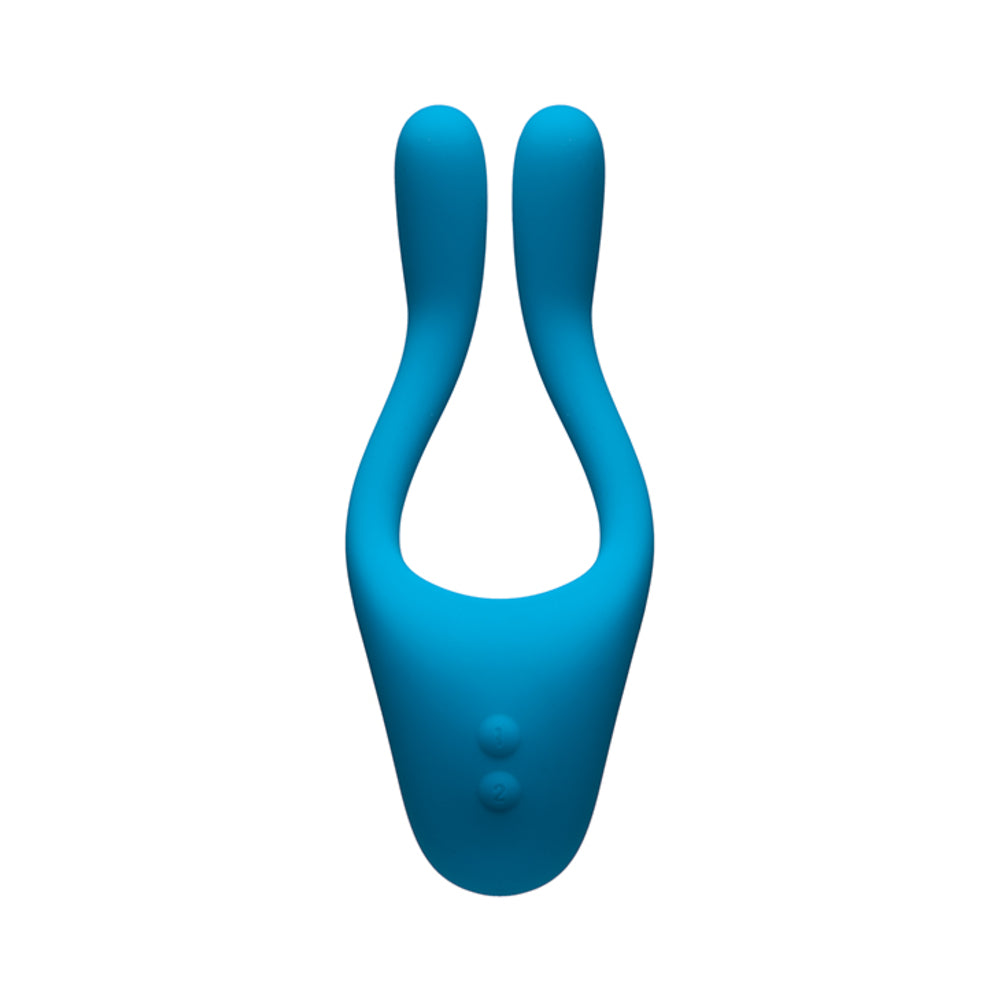 Tryst V2 Bendable Multierogenous Zone Massager with Remote Control Teal Blue from Doc Johnson Novelties. As Seen in Cosmopolitan Encounter limitless pleasure. The revolutionary Tryst Multi Erogenous Zone Massager, designed with both men and women in mind, is as versatile as your desire. Wear Tryst around the penis as a solo vibrator or partner pleasing cock ring, or use the firm but flexible arms to stimulate the clitoris and nipples. With three powerful motors, seven mind blowing massage patterns, and separate arm and base controls, Tryst is anything you want it to be. Size 5.75 inches in total length, 2.25 inches insertion length. Massager is USB Rechargeable. Remote control requires 1 AAA battery, not included.