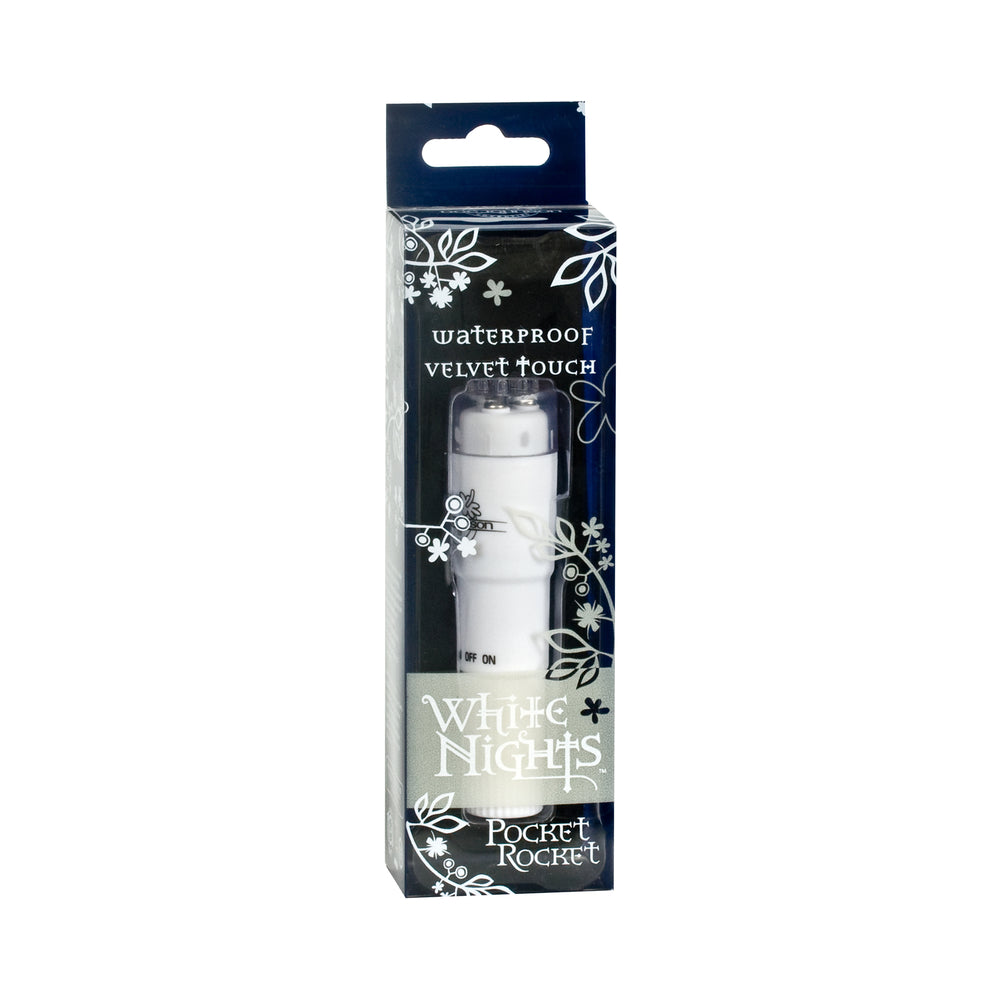 White Nights Pocket Rocket. Baby it is cold outside! Warm up those cold nights with this snowy, velvety vibrating multi-speed pocket rocket from our White Nights collection. It will satisfy all of your naughty cravings. Discreet operation. Waterproof vibrations. Single speed vibe. Vibrator requires 1 AA battery, not included.