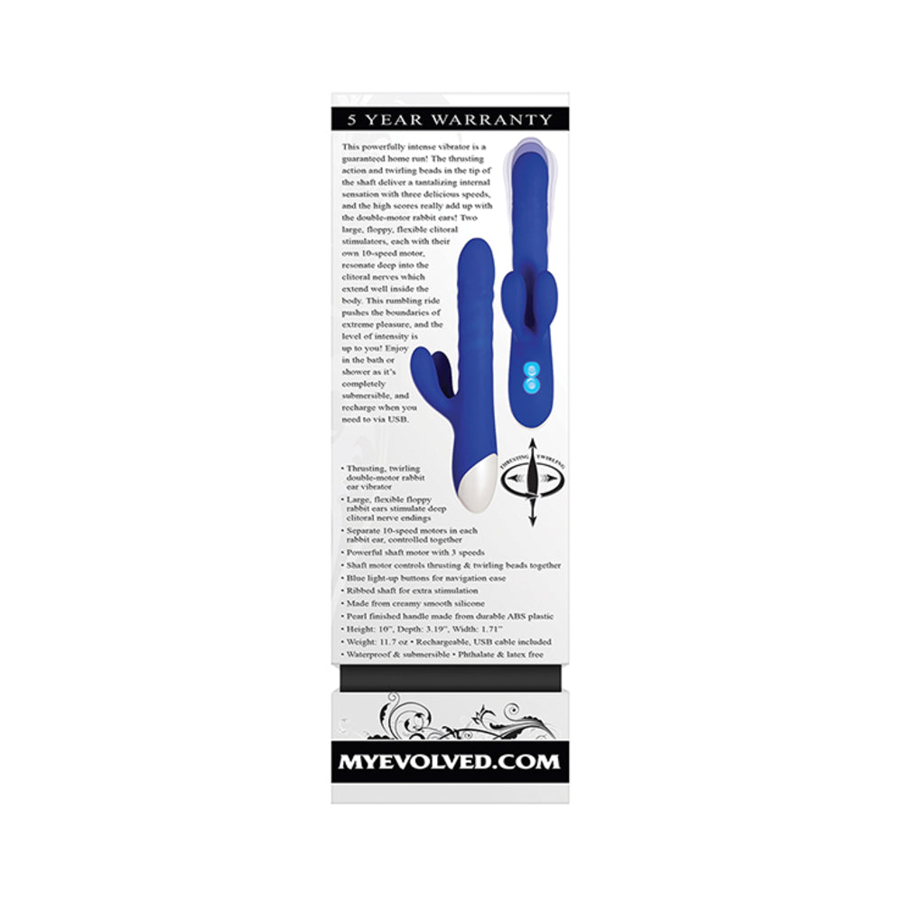 The thrusting action and twirling beads in the tip of the shaft deliver a tantalizing internal sensation with three delicious speeds, and the high scores really add up with the double motor rabbit ears! Two large, floppy, flexible clitoral stimulators, each with their own 10 speed motor, resonate deep into the clitoral nerves which extend well inside the body. This rumbling ride pushes the boundaries of extreme pleasure, and the level of intensity is up to you! Made from creamy smooth silicone. Pearl finished handle made from durable ABS plastic. Height 10 inches, depth 3.19 inches, width 1.71 inches. Weight 11.7 ounces. Waterproof and submersible vibrations. Phthalate free and latex free. Rechargeable, USB cable included.
