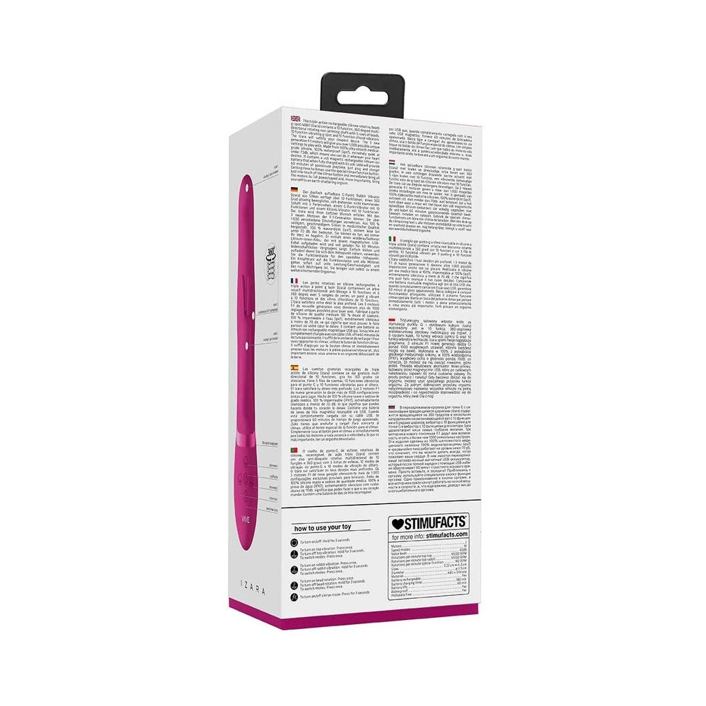 The IZARA, triple-action, beaded G-spot rabbit vibrator, has a 10 function, 360 degree multi directional rotating, non-jamming shaft, packed with 5 rows of beads. It also boasts a 10 function vibrating G-spot and 10 function clitoral vibrators.The IZARA most certainly packs a passionate punch. The 3 motors will give you over 1,000 possible unique settings to play with. Made from 100% silky smooth, medical grade silicone, it’s 100% waterproof (ipx7), and extremely quiet at under 70db, which means you can use it wherever your heart desires. It contains a usb magnetic rechargeable lithium-ion battery, that when fully charged with its usb cable, will provide 60 minutes of passionate playtime. Just plug and charge! When you’re getting close to climax, just one-touch of the special function climax button will immediately bring all the motors to full power/speed and, more importantly, bring you to an earth-shattering orgasm. Dimensions package 9.53″ x 4.25″ x 3.07″ Weight package 19.05 oz Product dimensions 22 x 4.3 x 6.9 cm Product weight 255.00 gram Product diameter 3.3 cm Insertable length 11.0 cm Quantity motors 3 Rotations per minute 9200 RPM Rotations vibration tip 10000 RPM Speed modes 10 Noise level 70 dB Rechargeable Yes Rechargeable time 180 min Recharged battery lifetime 60 min Waterproof Yes Splashproof Yes Phthalate free Yes> Materials Silicone, ABS